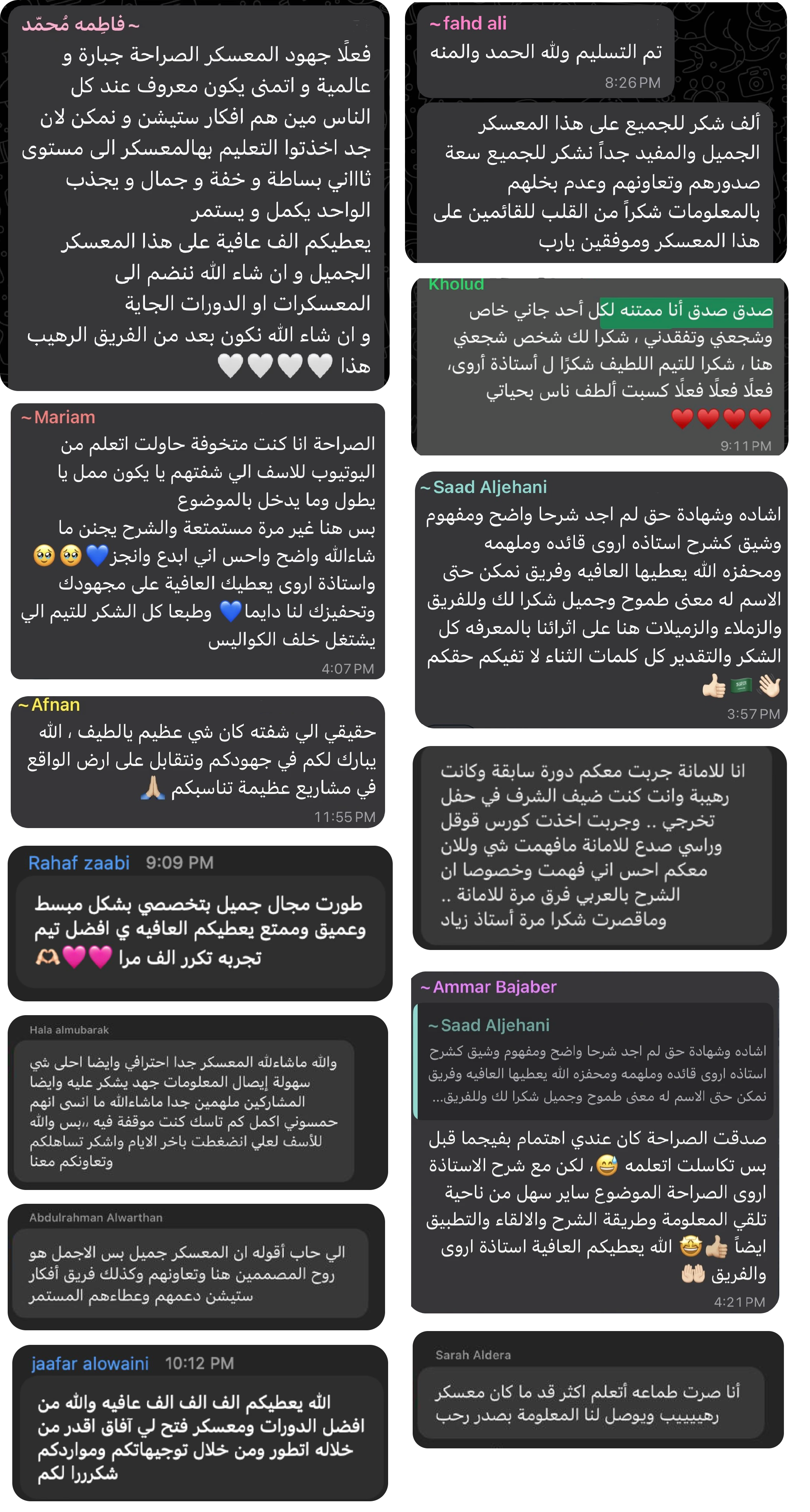 طبعاً! بمجرد اشتراكك بالمعسكر راح تتمكن من الدخول لمجموعتنا الحصرية على واتساب لبناء مهاراتك وتطويرها عن طريق التواصل مع بقية المشتركين.