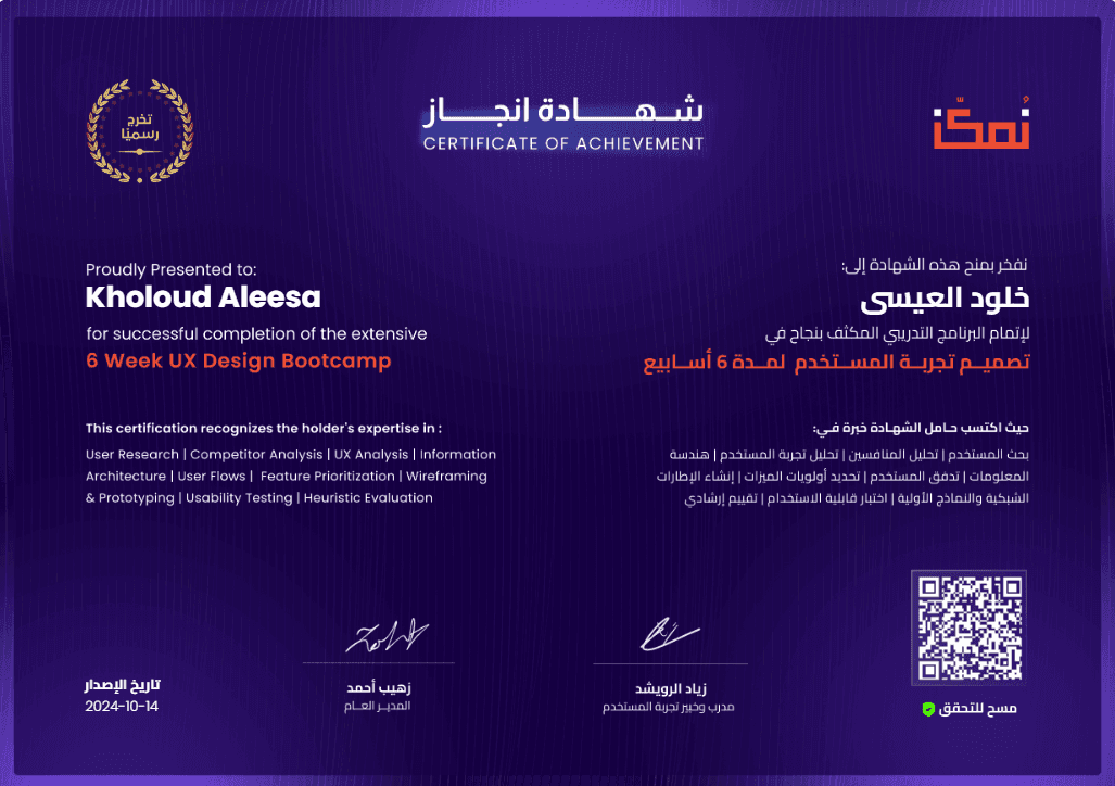 عند إكمال الدورة بنجاح، ستحصل على شهادة موثوقة تحمل اسمك وتفاصيل الإنجاز. يتميز تصميم الشهادة برمز QR مخصص يمكن مسحه للتحقق من صحة الشهادة بسهولة، مما يضيف مصداقية إلى مهاراتك ويعزز فرصك المهنية.