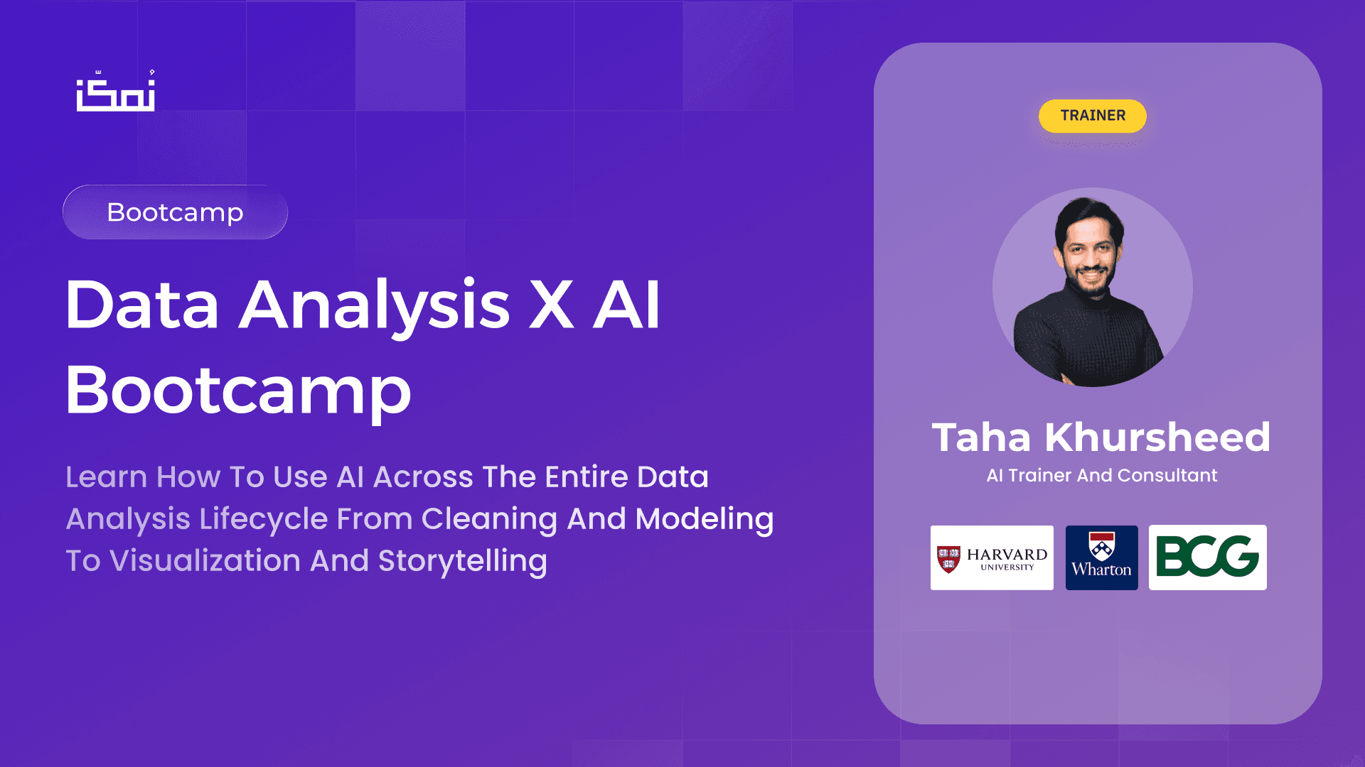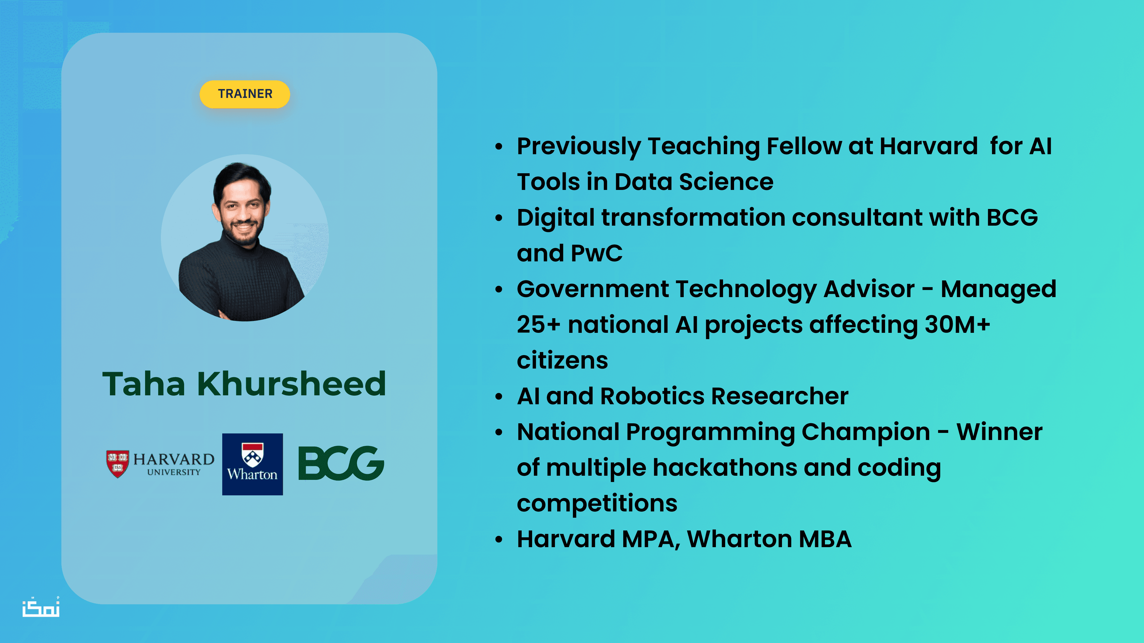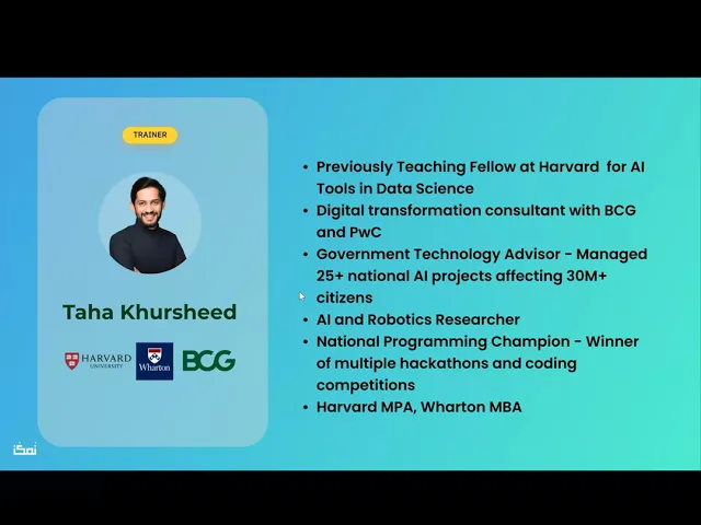أ. طه خرشيد مختص في البيانات والذكاء الاصطناعي والتقنية، وعنده خبرة قوية في التعليم والتطبيق العملي. يحمل ماجستير الإدارة العامة من جامعة هارفارد، وماجستير إدارة الأعمال من وارتون. سبق له العمل كـ Teaching Fellow في جامعة هارفارد، ودرّس أدوات الذكاء الاصطناعي في علم البيانات. واشتغل كمستشار في مشاريع التحول الرقمي مع BCG وPwC، وساعد جهات كثيرة في تبنّي حلول حديثة في البيانات والذكاء الاصطناعي.